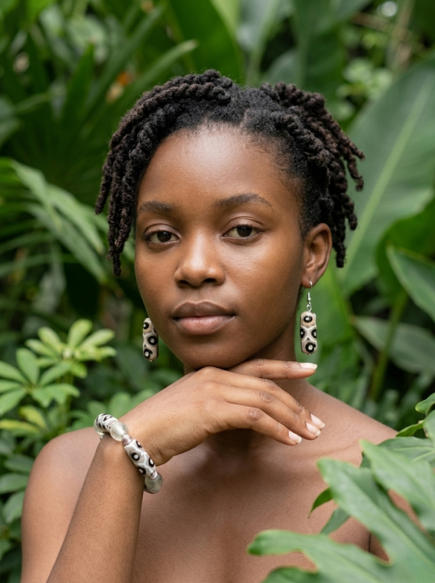 The set features oversized, hand-etched beads showcasing traditional tribal motifs in a classic monochrome palette. These are beautifully offset by frosted recycled glass and delicate silver-tone spiral spacers, evoking the serene textures of the coast and the raw beauty of the savannah. The Gladys set isn't just an accessory; it's a wearable piece of art.