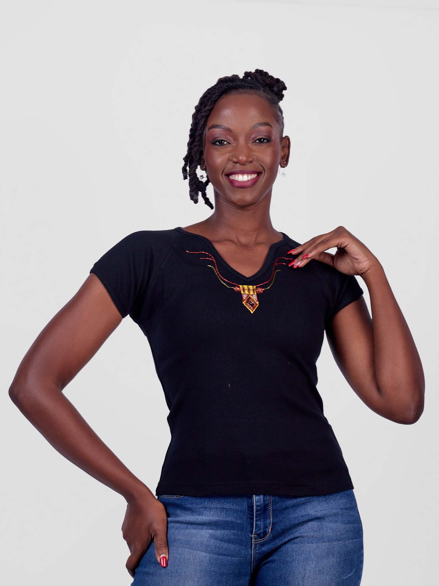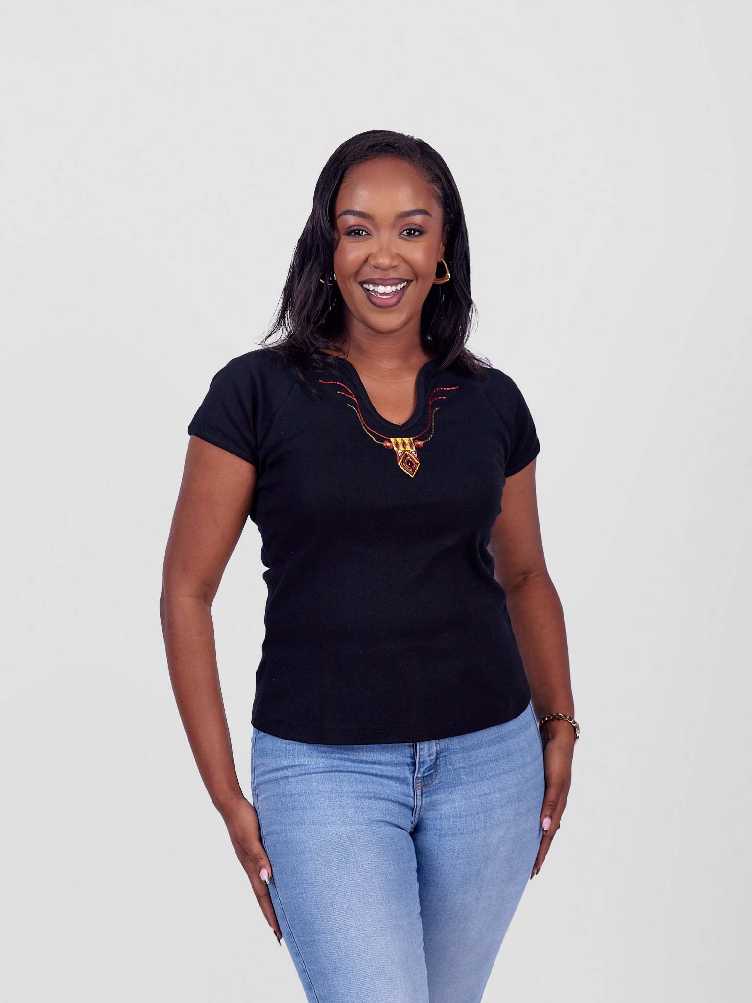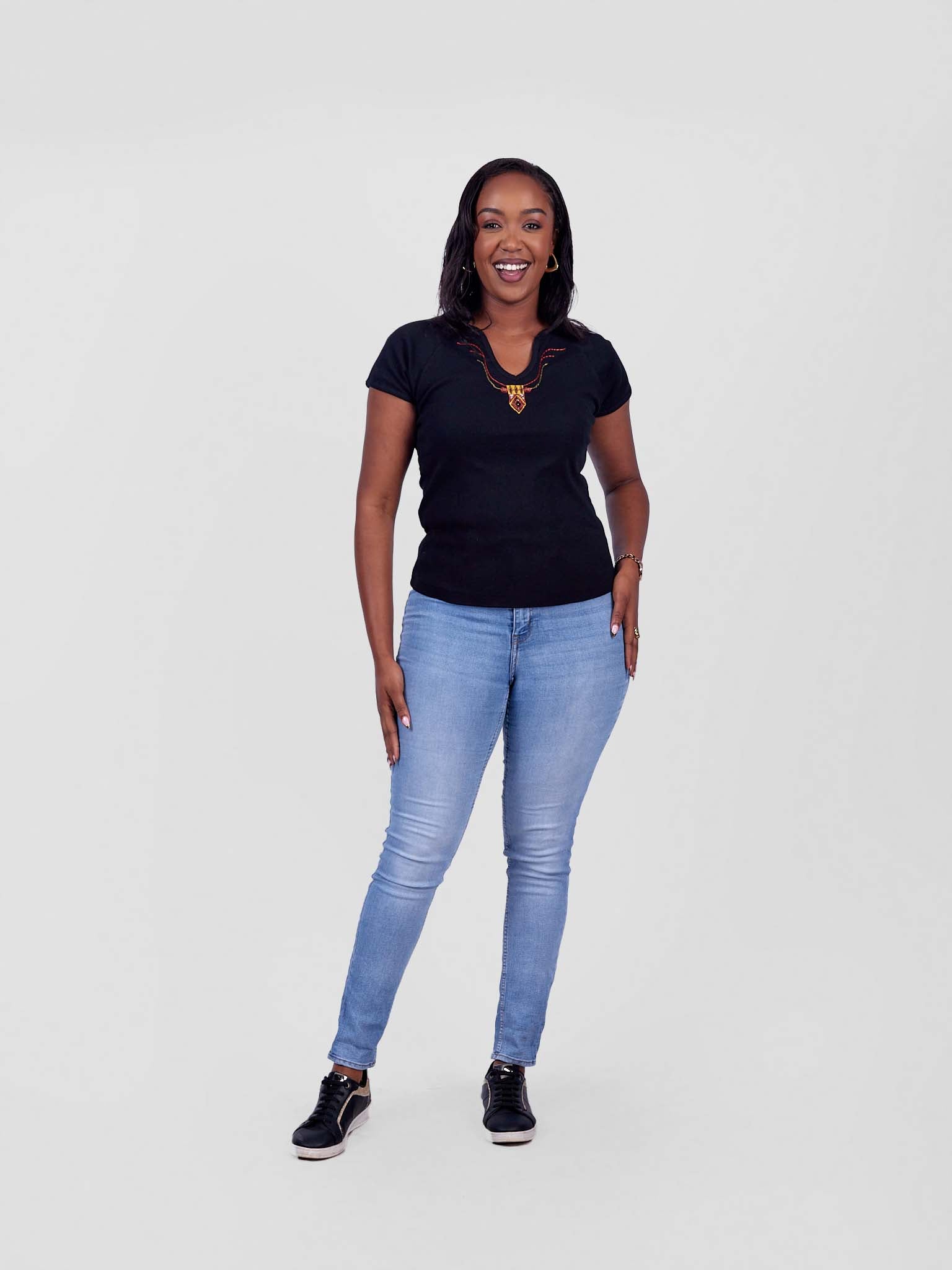 Elevate your style with our Steffi Rib Ankara Beaded Ladies T-Shirt! Our t-shirt features intricate beaded detailing and a unique ankara rib design. Stand out from the crowd and feel confident in this elegant and bold statement piece.