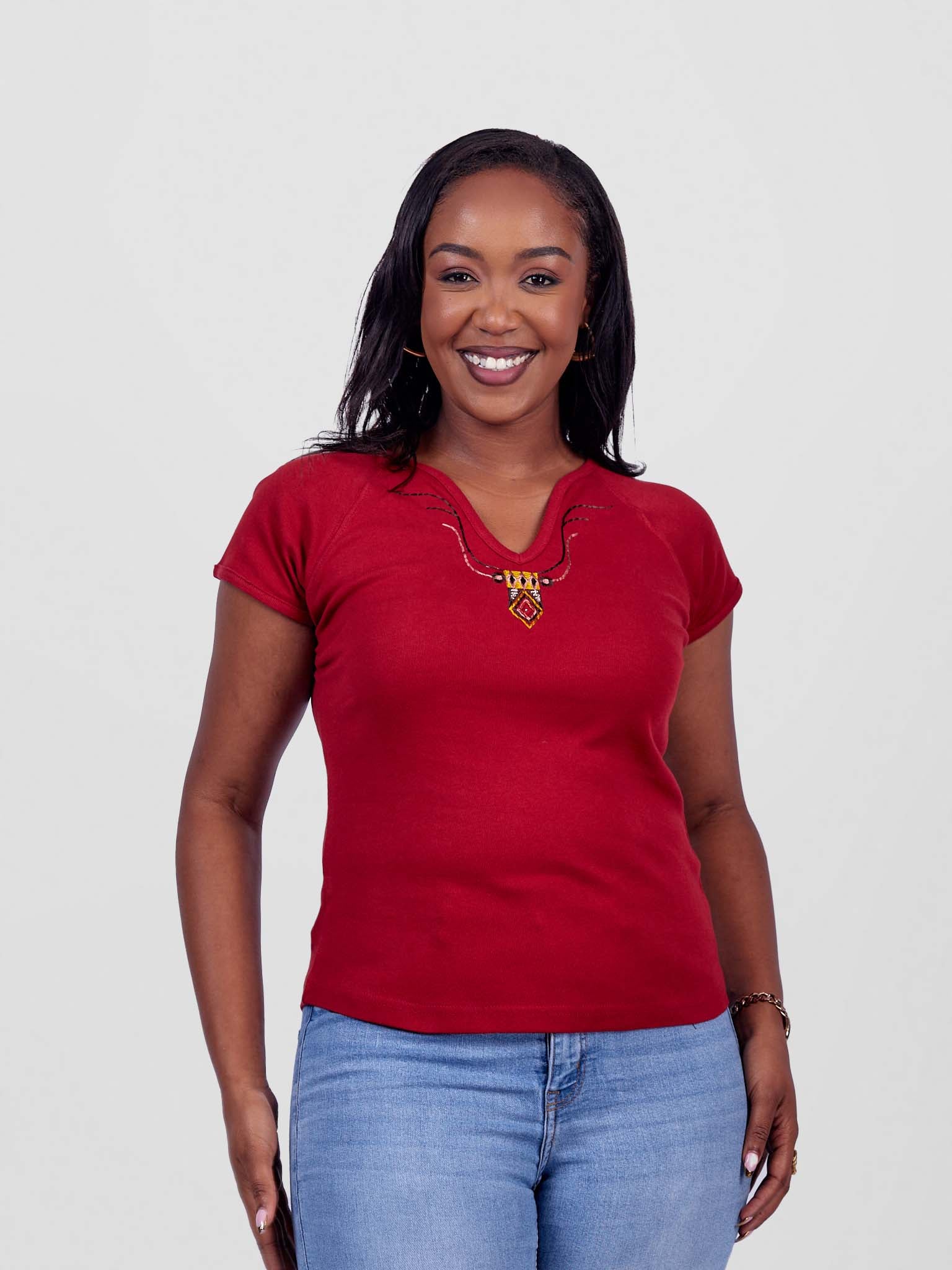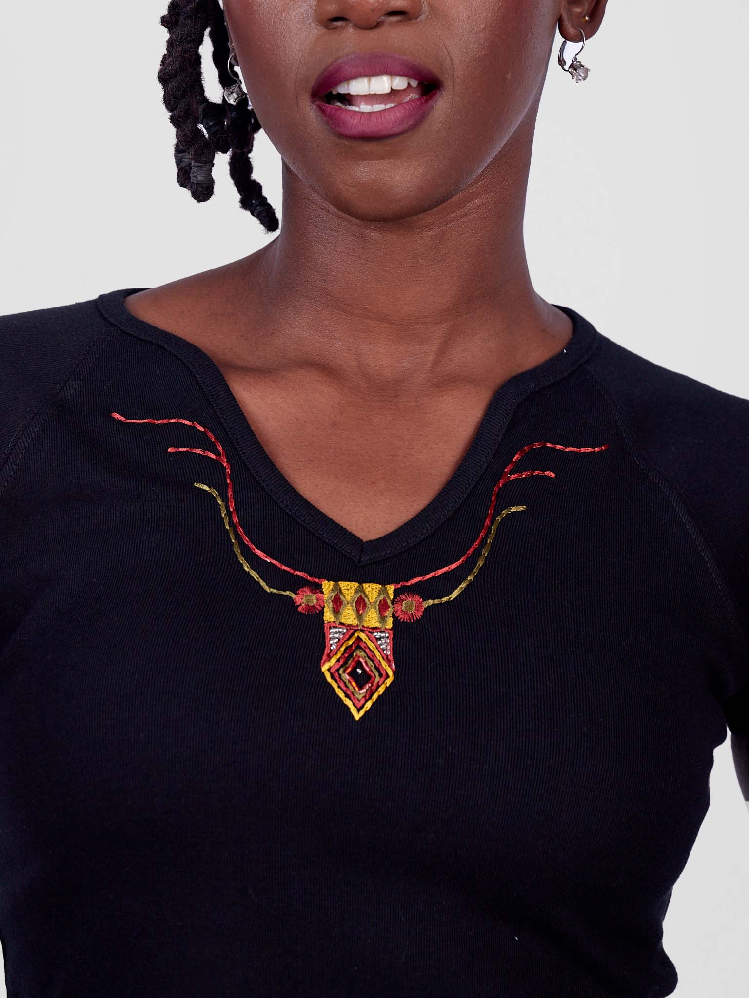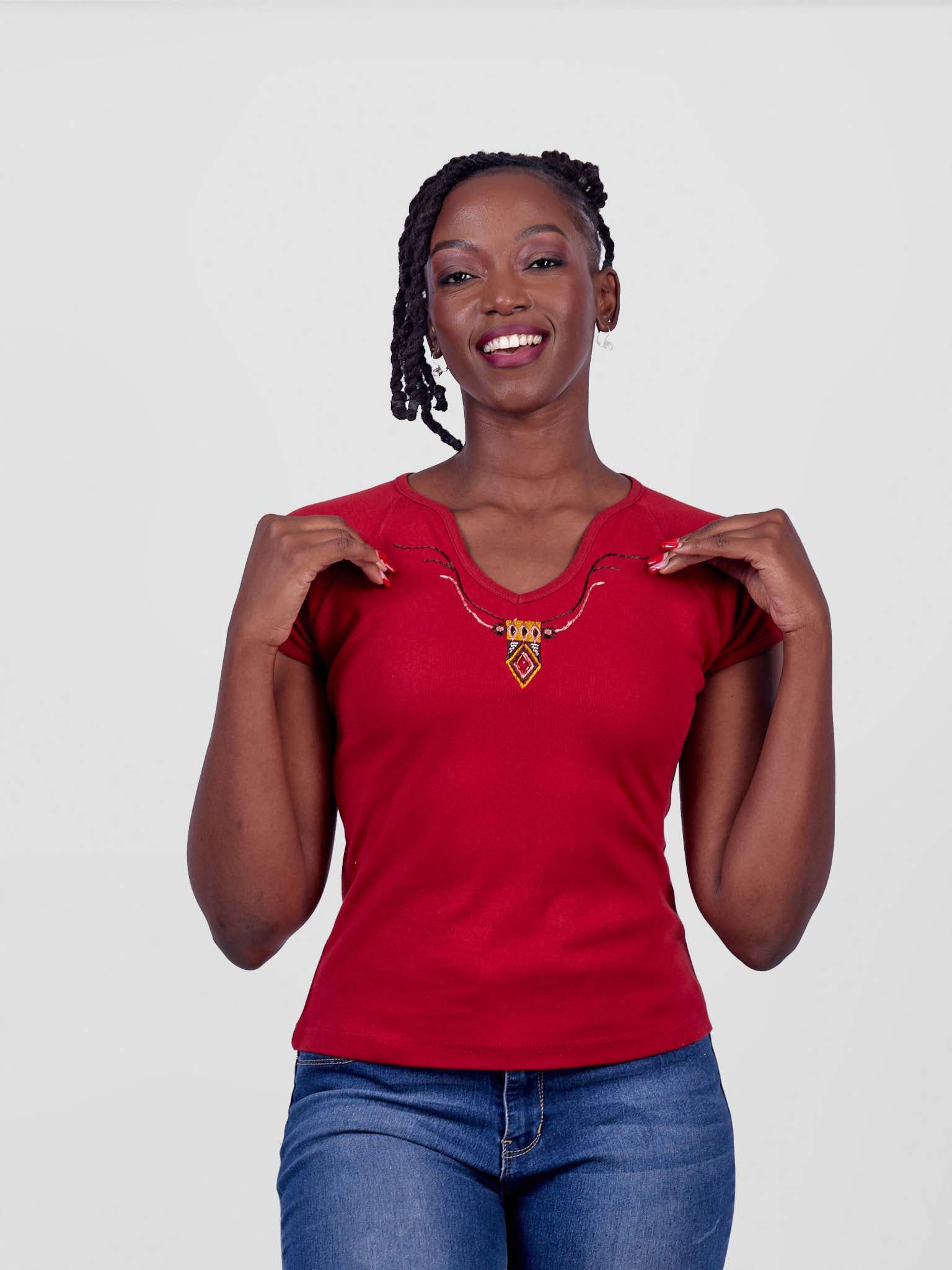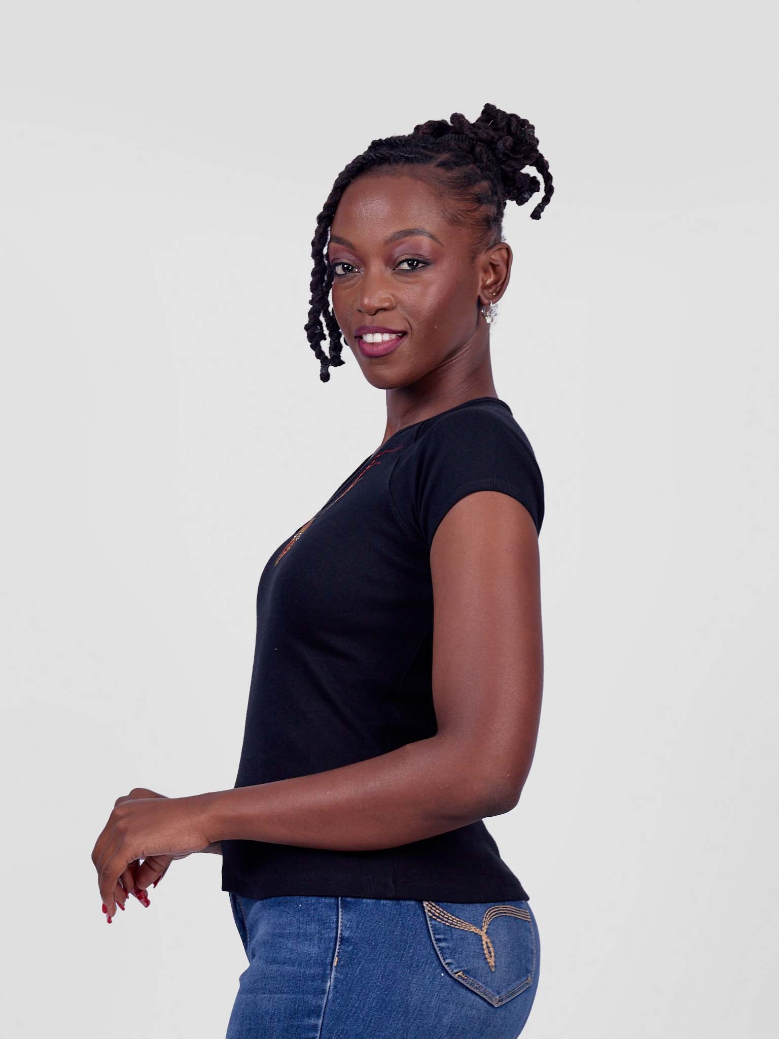 Elevate your style with our Steffi Rib Ankara Beaded Ladies T-Shirt! Our t-shirt features intricate beaded detailing and a unique ankara rib design. Stand out from the crowd and feel confident in this elegant and bold statement piece.